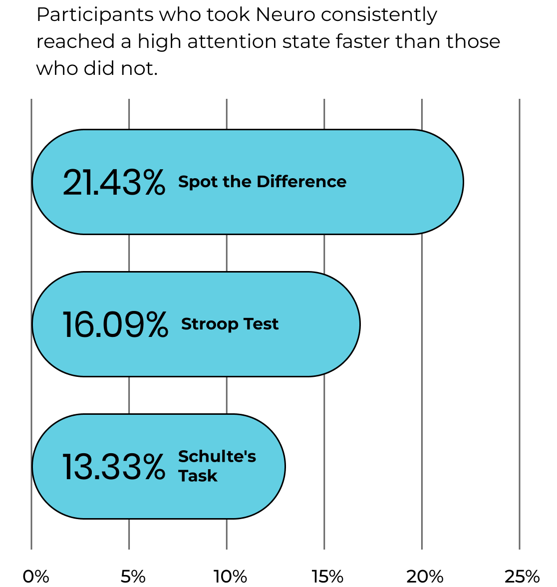 20 participants were asked to complete 3 cognitive tasks: Spot the Difference, Stroop Test, and Schulte's Table. The participants were broken up into 3 groups, the control group (no mints), the focus group (taking Neuro’s Energy & Focus Mints), and a placebo group (given a regular mint).