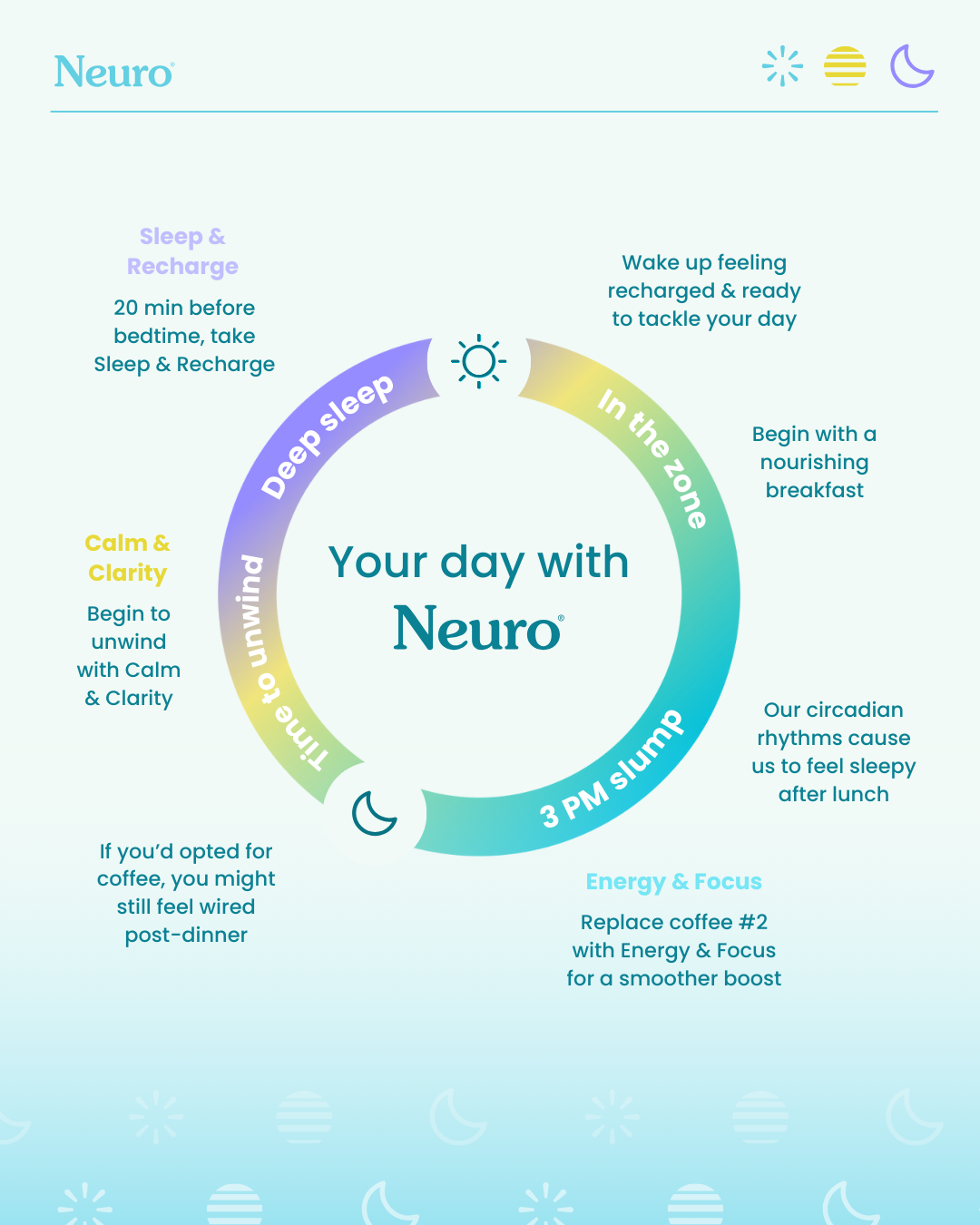 Neuro’s got you covered around the clock. Big goals require energy and focus, start swapping your second cup of coffee, (or even first cup of coffee!) to give you an optimal, balanced boost of energy without the jitters.